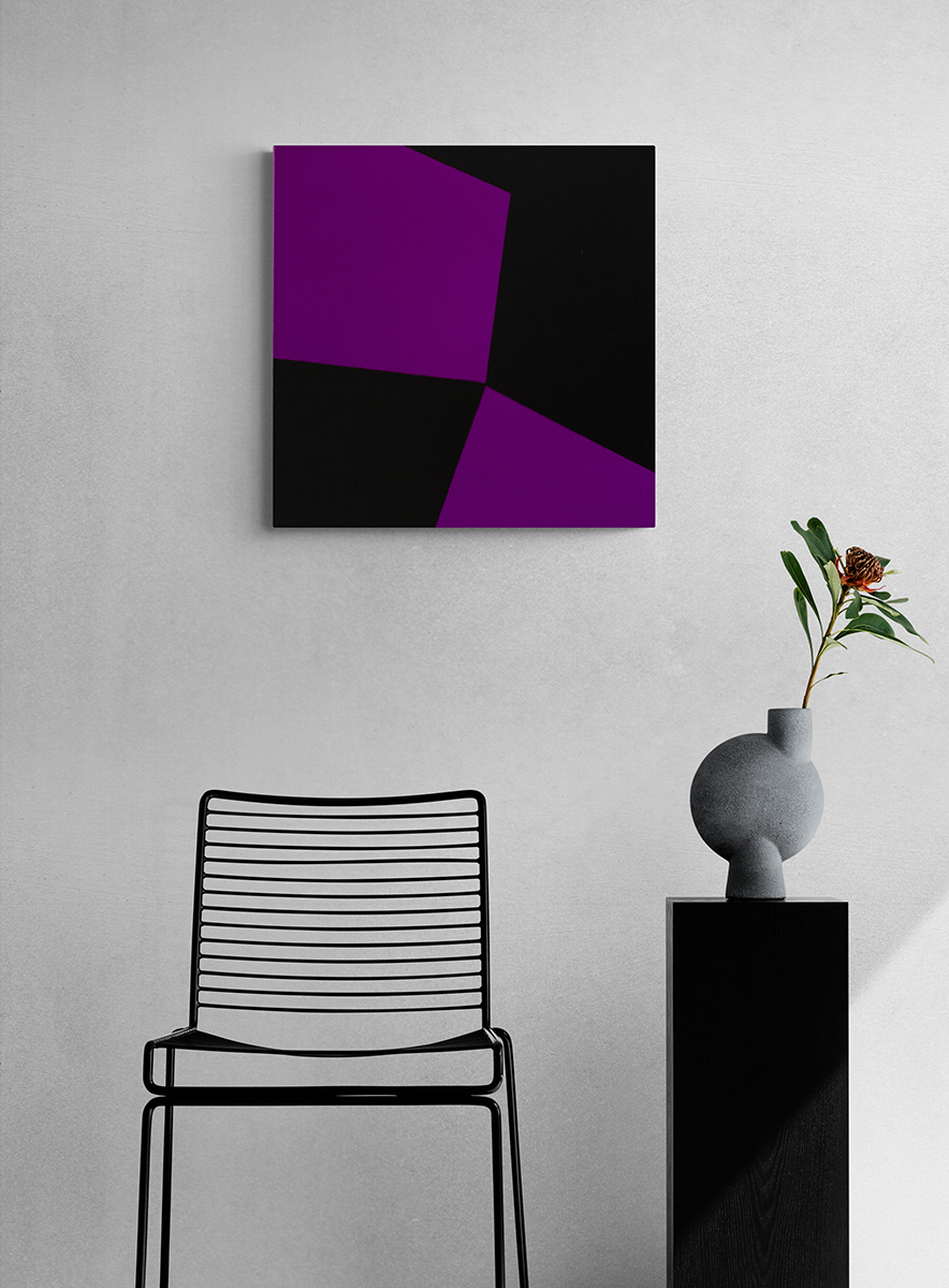 Gemälde: Abstrakt, mit violetten und schwarzen Flächen, die sich ineinander verschränken. Minimalistische abstrakte Farbfeldmalerei.