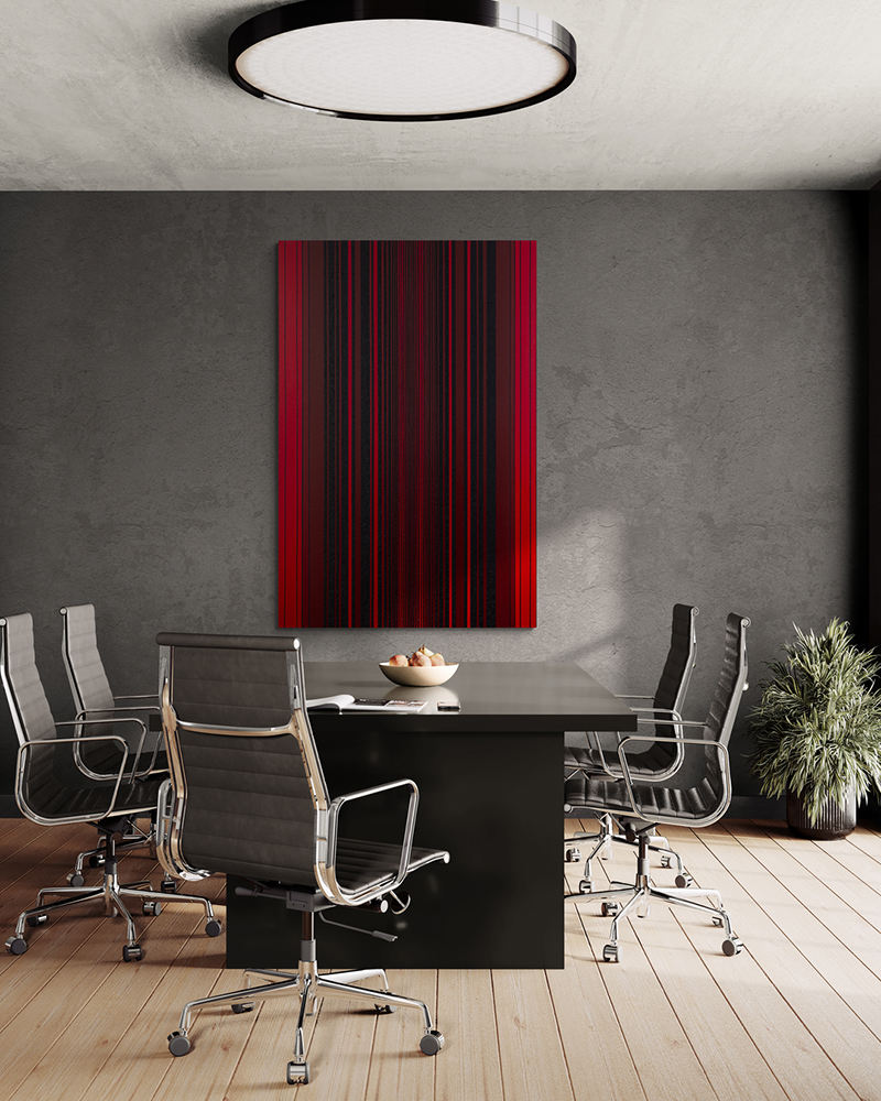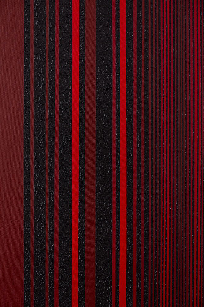 The painting KH#343 is an abstract-concrete work structured by a dense rhythmic sequence of vertical stripes. Pure pigments of purple red and Caput Mortuum, together with their mixtures, create a nuanced chromatic field.