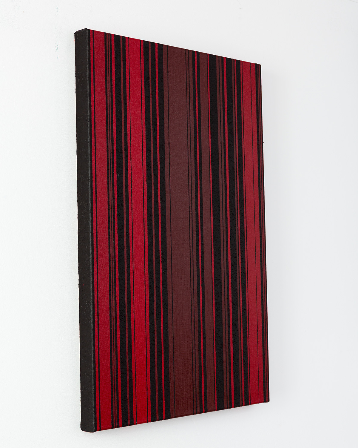 Dieses abstrakte Gemälde untersucht den Rhythmus und die Spannung zwischen Rot und Schwarz durch präzise ausbalancierte vertikale Strukturen.