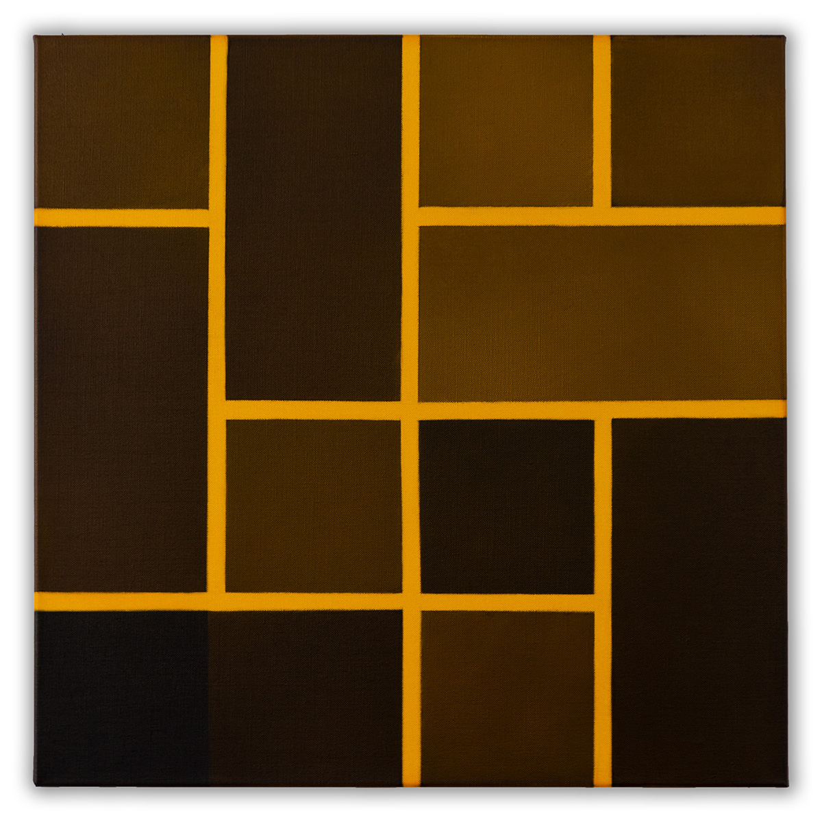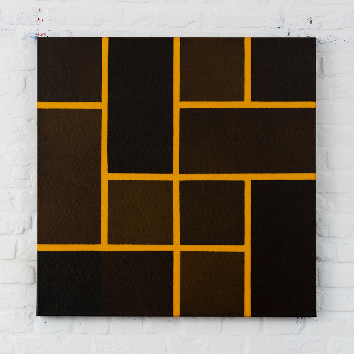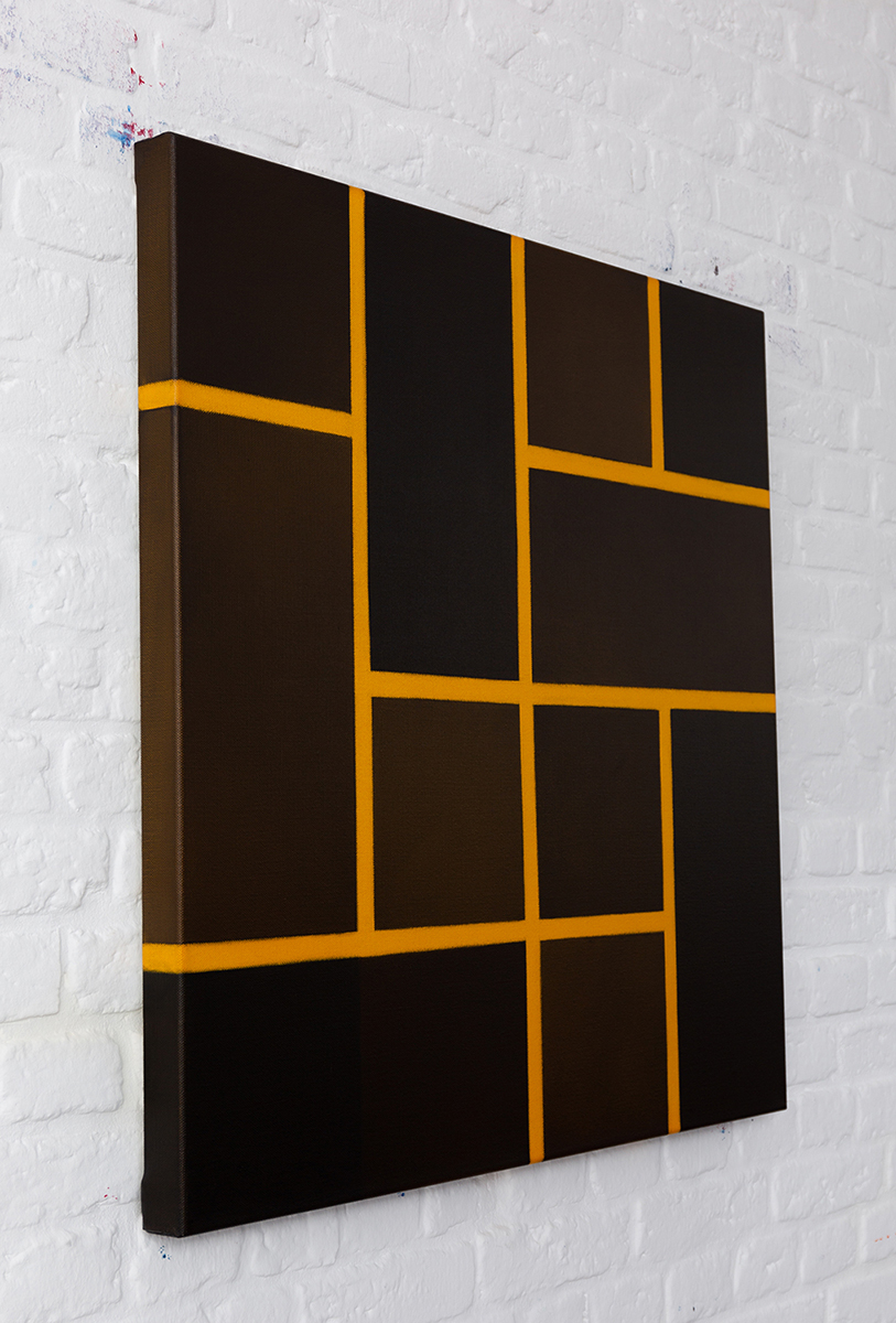Gemälde: Abstrakt, konstruktiv mit gelben Strukturen auf schwarzem Grund. Minimalistische abstrakte Farbfeldmalerei.