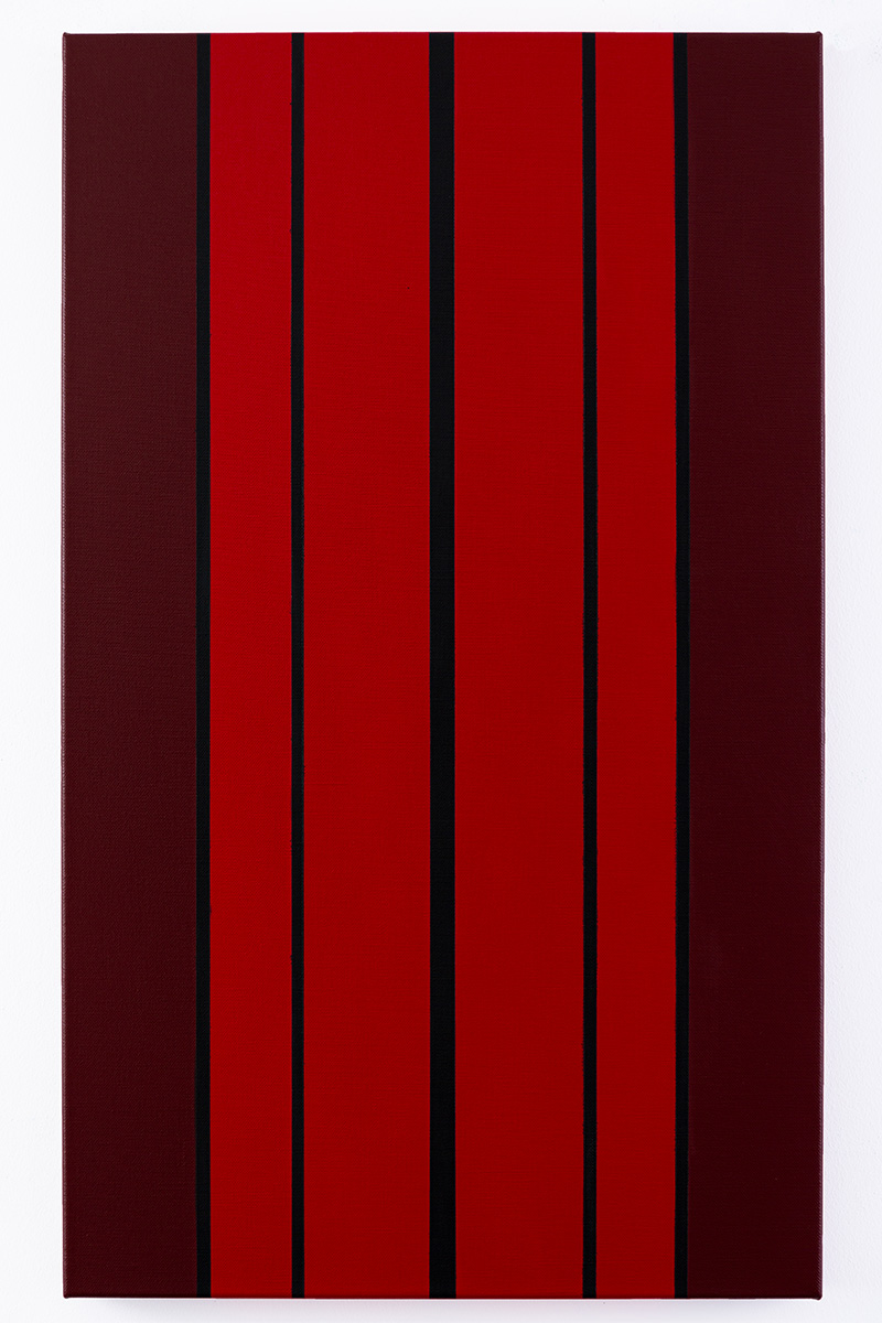 Gemälde: Abstrakt, mit vertikalen roten, dunkelroten, braunen und schwarzen Streifen. Minimalistische abstrakte Farbfeldmalerei.
