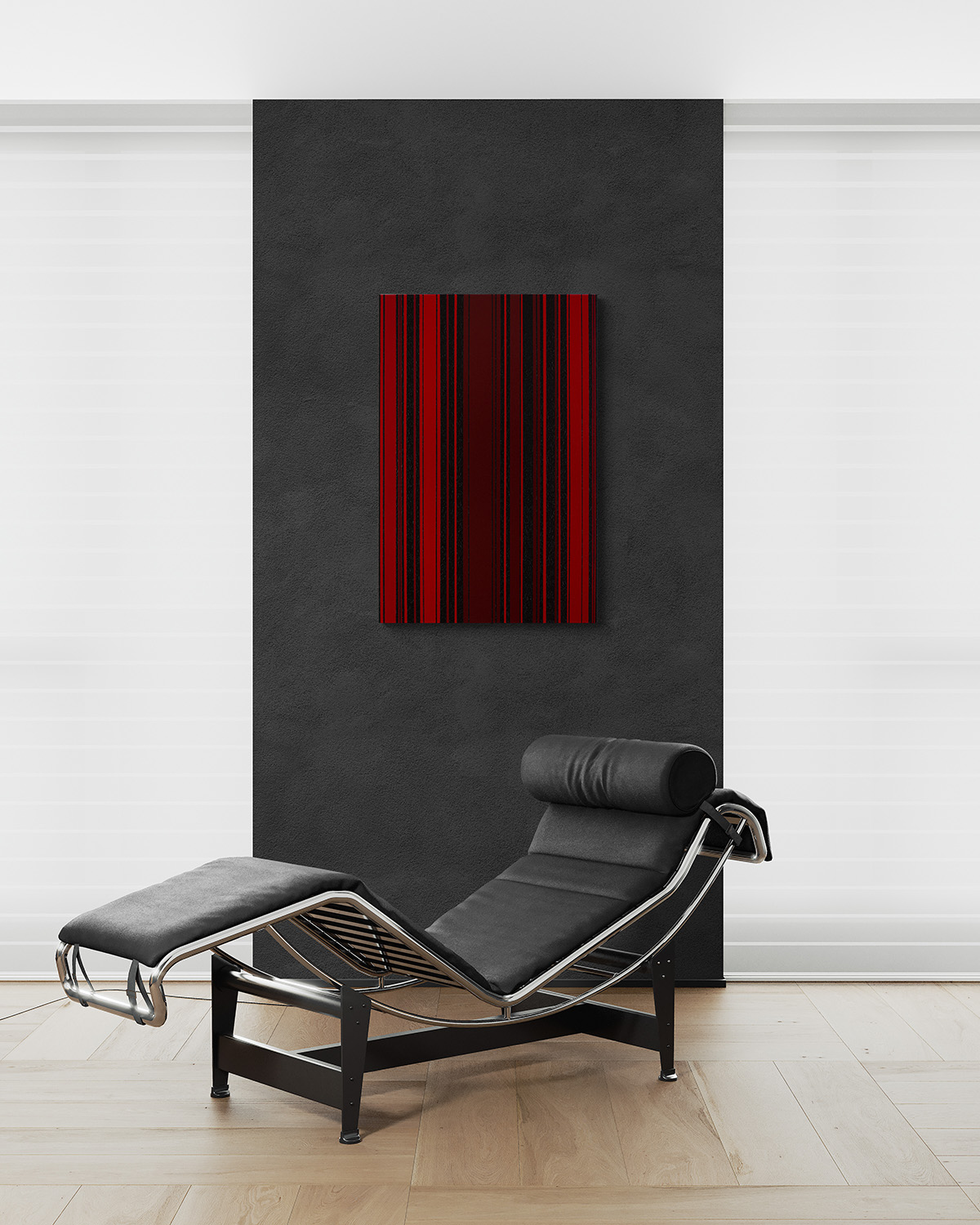 Dieses abstrakte Gemälde untersucht den Rhythmus und die Spannung zwischen Rot und Schwarz durch präzise ausbalancierte vertikale Strukturen.